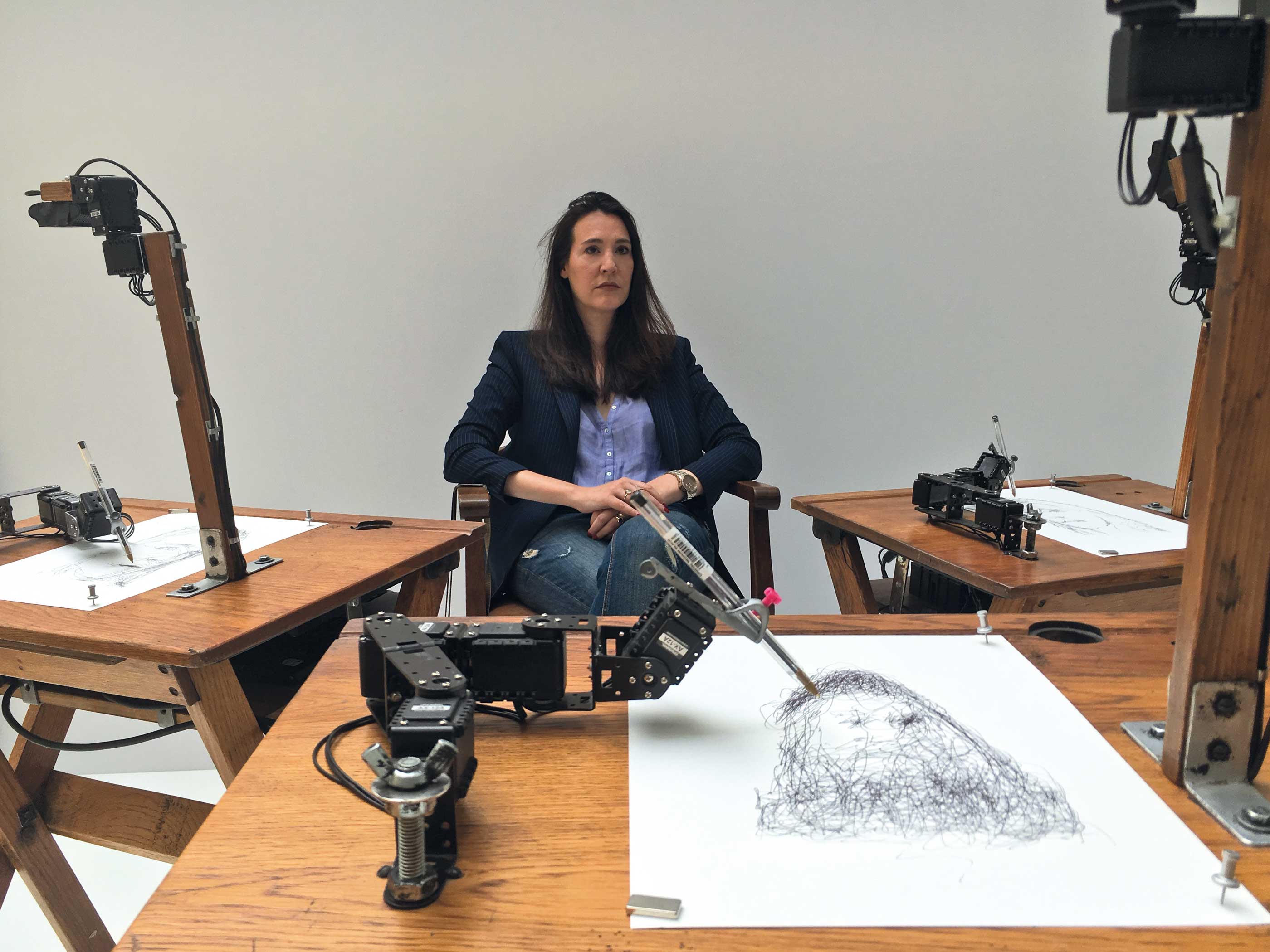 Die kleinen Kamera-Linsen der „drei Robots named Paul“ (3RNP) fixieren abwechelnd mein Gesicht und das Papier auf dem sie mich, in einer 30- bis 40-minütigen Sitzung, zu zeichnen beginnen. Ich fühle mich beobachtet, bekomme im Laufe der Sitzung immer mehr das Gefühl, von lebenden Wesen beobachtet zu werden. Ein bestimmtes Geräusch, das sie bei jeder Bewegung hervorrufen, verrät mir, wann sie mich wieder anblicken. Ich sehe hin und schaue abwechselnd jedem der drei Pauls ins Auge.